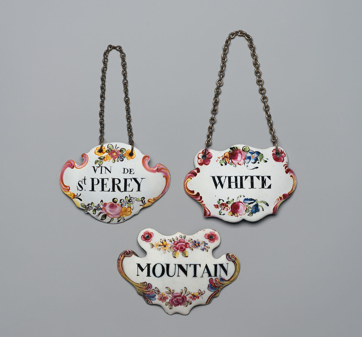 Inscribed "Mountain" (referring to a Spanish wine), "Vin de St. Perey," and "White," respectively, these labels would have identified the contents of a decanter (a more elegant alternative to a wine bottle) at the dinner table.