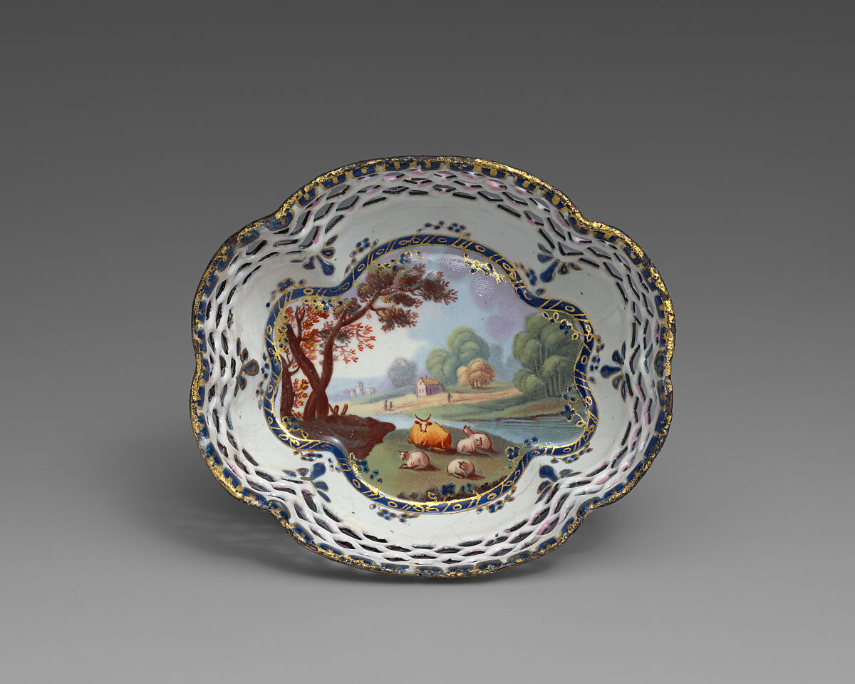Enameled objects like this one, intended to imitate the lustrous quality of porcelain, were among the more affordable goods sold at toyshops across London and in fashionable English resort towns. Though often called "Battersea enamels" in common parlance (referring to the manufactory at York House, Battersea, operating only between 1753 and 1756), we rarely know exactly where individual pieces were made. The main centers of enamel production were in London, South Staffordshire (particularly in Bilston and Wednesbury), and Birmingham.