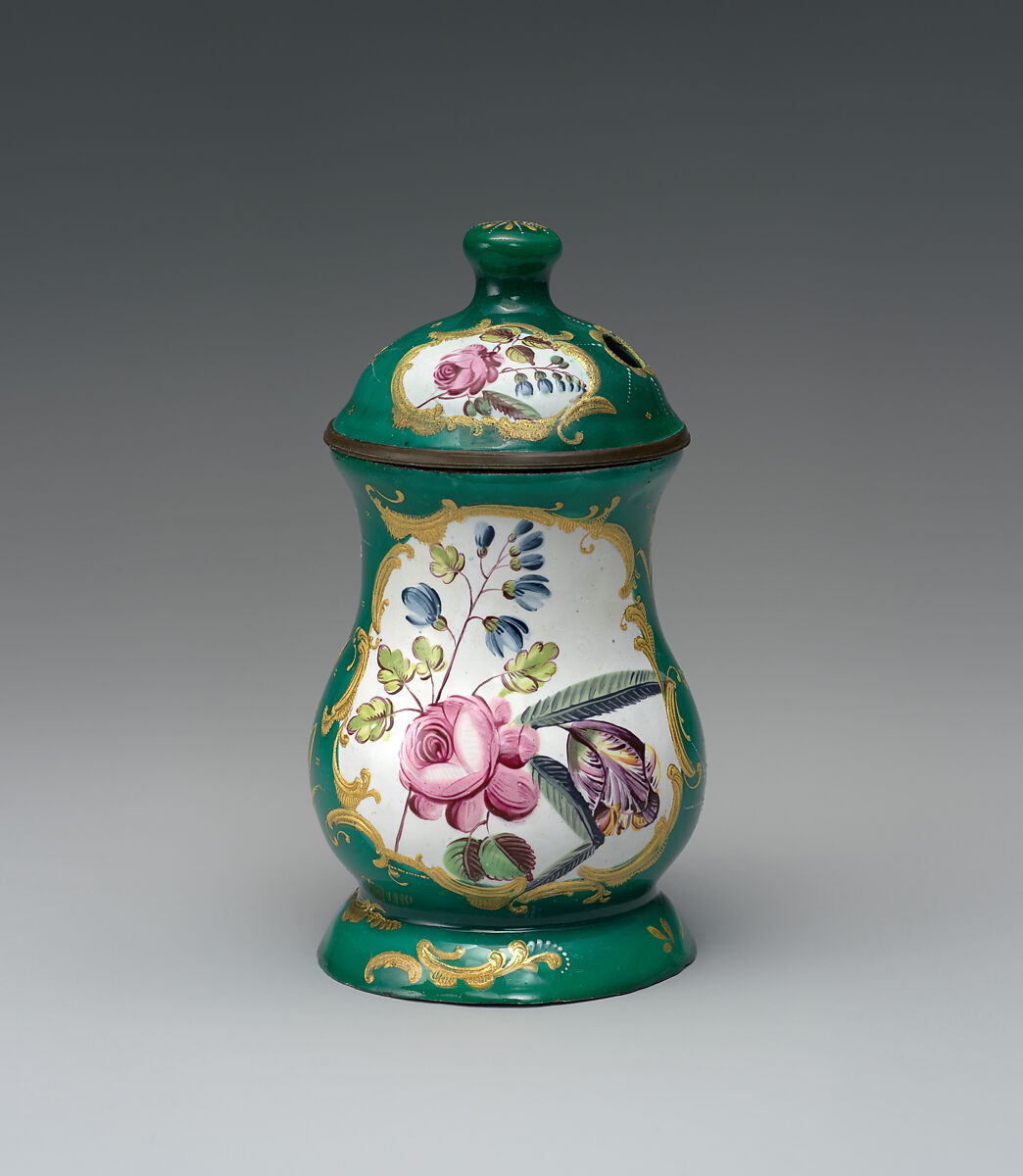 Enameled objects like this one, intended to imitate the lustrous quality of porcelain, were among the more affordable goods sold at toyshops across London and in fashionable English resort towns. Though often called "Battersea enamels" in common parlance (referring to the manufactory at York House, Battersea, operating only between 1753 and 1756), we rarely know exactly where individual pieces were made. The main centers of enamel production were in London, South Staffordshire (particularly in Bilston and Wednesbury), and Birmingham.