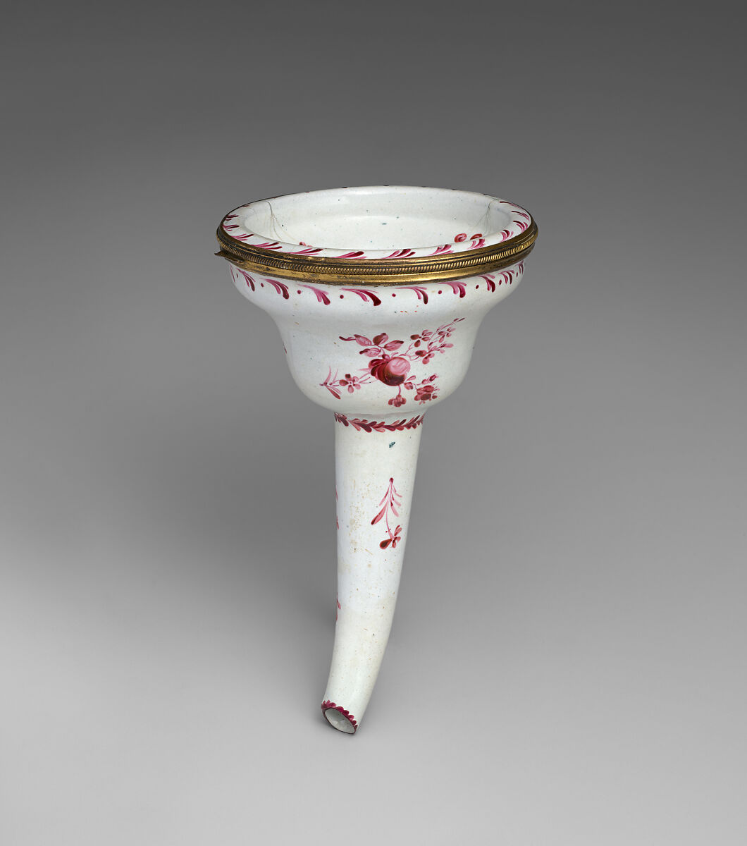 Wine funnels were sold alongside other luxurious trinkets, known as "toys," through which wealth and taste could be displayed. Some toys were functional, intended to store foodstuffs, cosmetic products, or snuff; others were intended for no purpose other than to delight. Some were made of precious metals, like gold or silver, and were sold at correspondingly high prices; others employed relatively inexpensive materials and were thus available to the expanding middle classes.