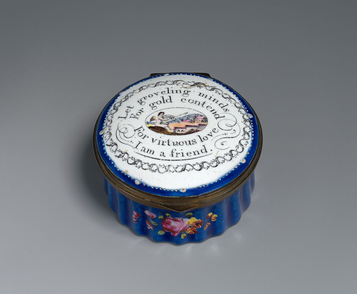 Enameled objects like this one, intended to imitate the lustrous quality of porcelain, were among the more affordable goods sold at toyshops across London and in fashionable English resort towns. Though often called "Battersea enamels" in common parlance (referring to the manufactory at York House, Battersea, operating only between 1753 and 1756), we rarely know exactly where individual pieces were made. The main centers of enamel production were in London, South Staffordshire (particularly in Bilston and Wednesbury), and Birmingham.