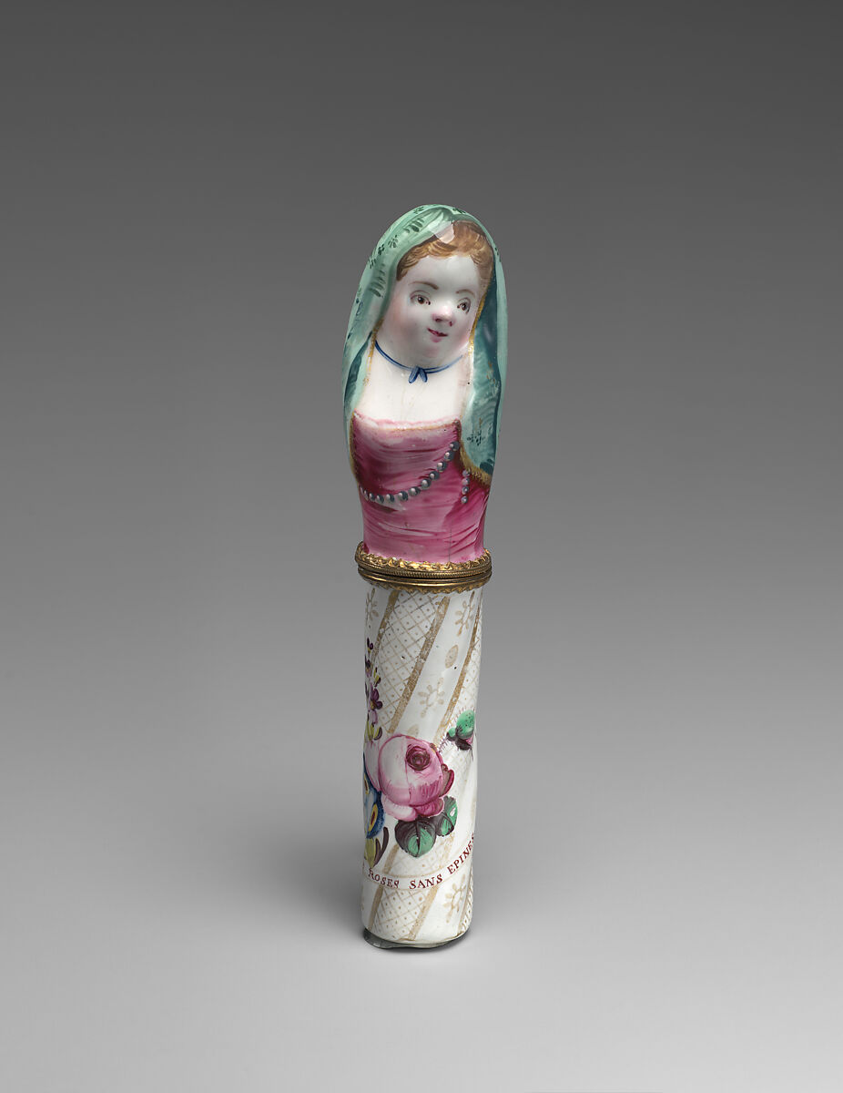 Small enough to carry in a pocket, this cylindrical case would have held bodkins (oversized sewing needles), that could be used to tie together separate pieces of clothing, like sleeves, with ribbon. This object—its design inspired by similar, more expensive cases produced by the celebrated Chelsea Porcelain Manufactory in the 1750s and 60s—is wittily inscribed "point de roses sans epines" ("no roses without thorns") in reference to its floral decoration and sharp contents.