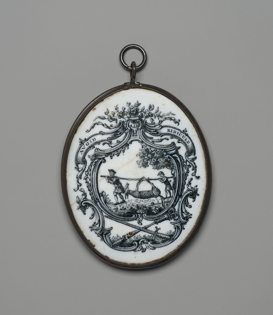 Enameled objects like this one were intended to imitate the lustrous quality of porcelain at more affordable prices. By the middle of the eighteenth century, technological innovations had made it possible to roll copper, instead of the far costlier gold, into very thin sheets. Powdered glass mixed with minerals (to determine the opacity and color of the enamel) would then be applied onto the copper sheets and fired at high temperatures. A design—whether a famous portrait, generic pastoral scene, or floral motif— could be painted on by hand or copied from an engraving through the newly invented process of transfer printing. Many enameled objects combined both methods of decoration and would be refired after the application of each new layer or color.