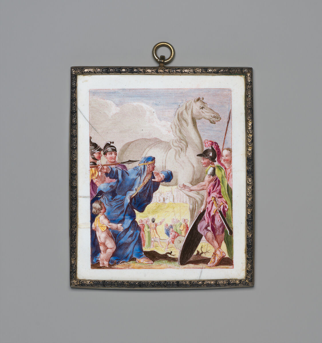 Despite operating for just a few years between 1753 and 1756, the York House factory in Battersea remains the most renowned of all British enamel manufactories because of the superior quality of its transfer printed designs. This decorative plaque depicts the Trojan priest Laocoon cautioning against bringing the wooden horse left by the Greeks into the city; his warning ultimately went unheeded.