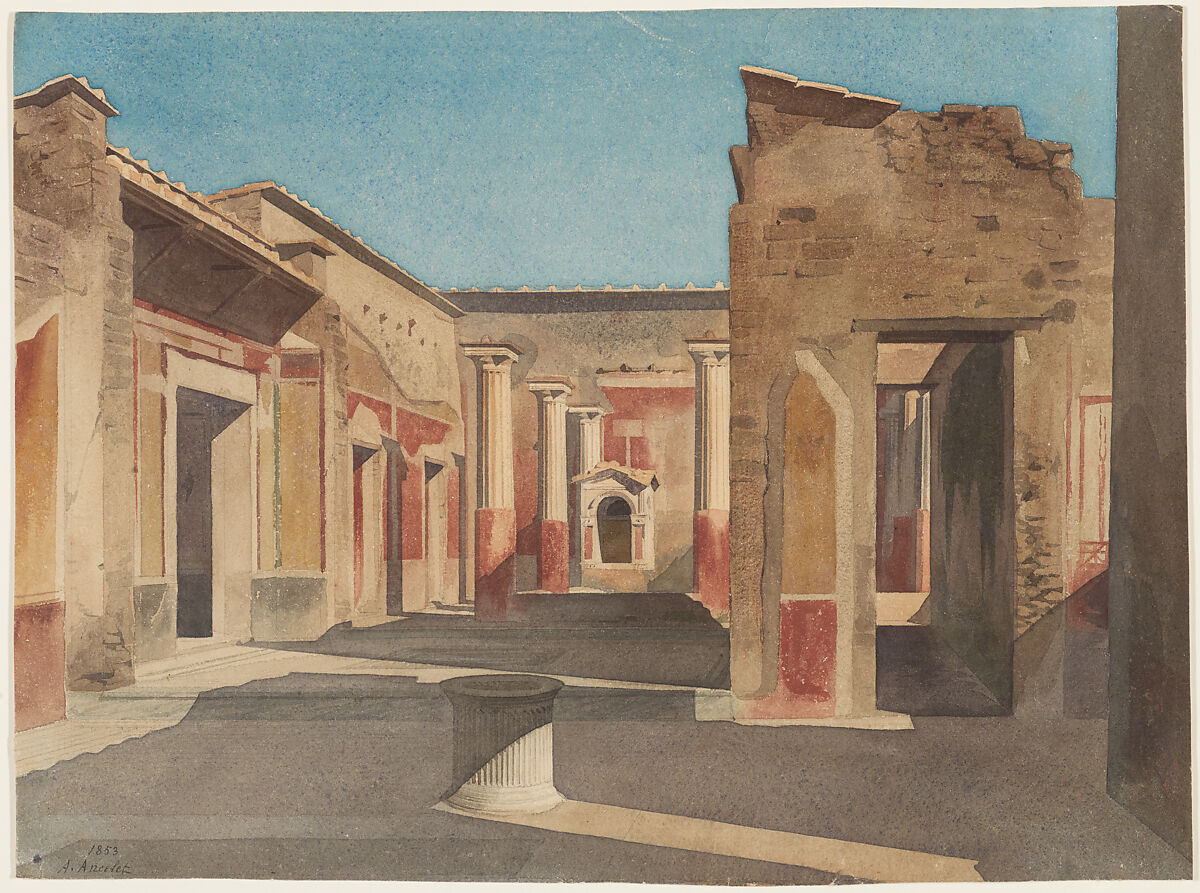 While studying in Italy as winner of the Prix de Rome for architecture in 1851, Ancelet took a great interest in the recently excavated sites of Pompeii and the Appian Way. He executed this drawing with an architect’s precision, first laying out his composition with ruled graphite perspectival lines before applying the watercolor. His study brilliantly captures the strong light and shadows as they fell across the ruins on a cloudless day.