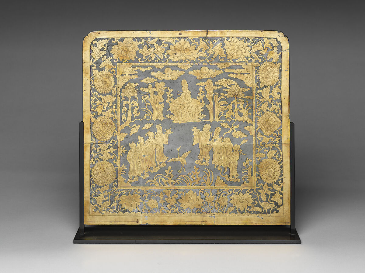 Luxury writing accessories with religious subjects were used by literati to manifest their wishes. This tabletop screen, which protects inkstone from dust, illustrates a popular Daoist subject. The deity of longevity (Shoulao), identified by his prominent bald cranium, sits on a garden rock. The eight immortals stand in two lines and greet him on his birthday with various gifts. Below the rock pedestal, four incised characters convey every scholar’s aspiration: ci jinshi di, or “confer the jinshi degree,” the highest degree in the imperial civil service exam.