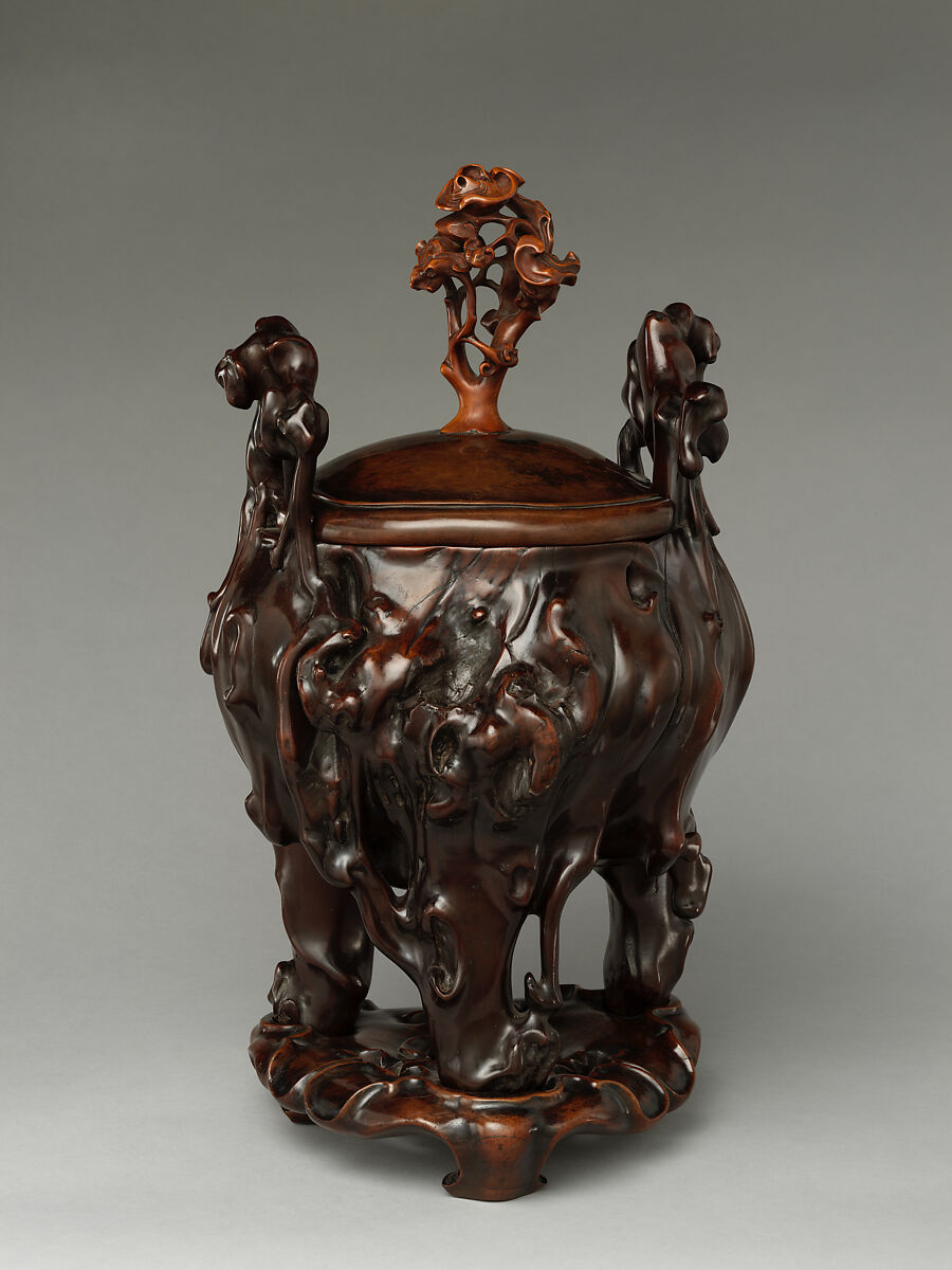 This massive tripod incense burner is a rare example of Chinese rootwood carving. Known as “natural wood” (tianran mu), such objects sought to evoke a rustic lifestyle by accentuating the irregularities inherent in rootwood over the regular surfaces of most human-made objects. Replicating the shape of a bronze tripod, it was further imbued with the archaistic taste so highly appreciated among the literati, reflecting both objects of antiquity and nature.
