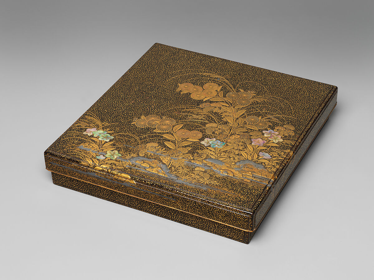 - Medium: Lacquered wood with gold, silver takamaki-e, hiramaki-e, togidashimaki-e, cut-out gold and silver foil application, mother-of-pearl inlay