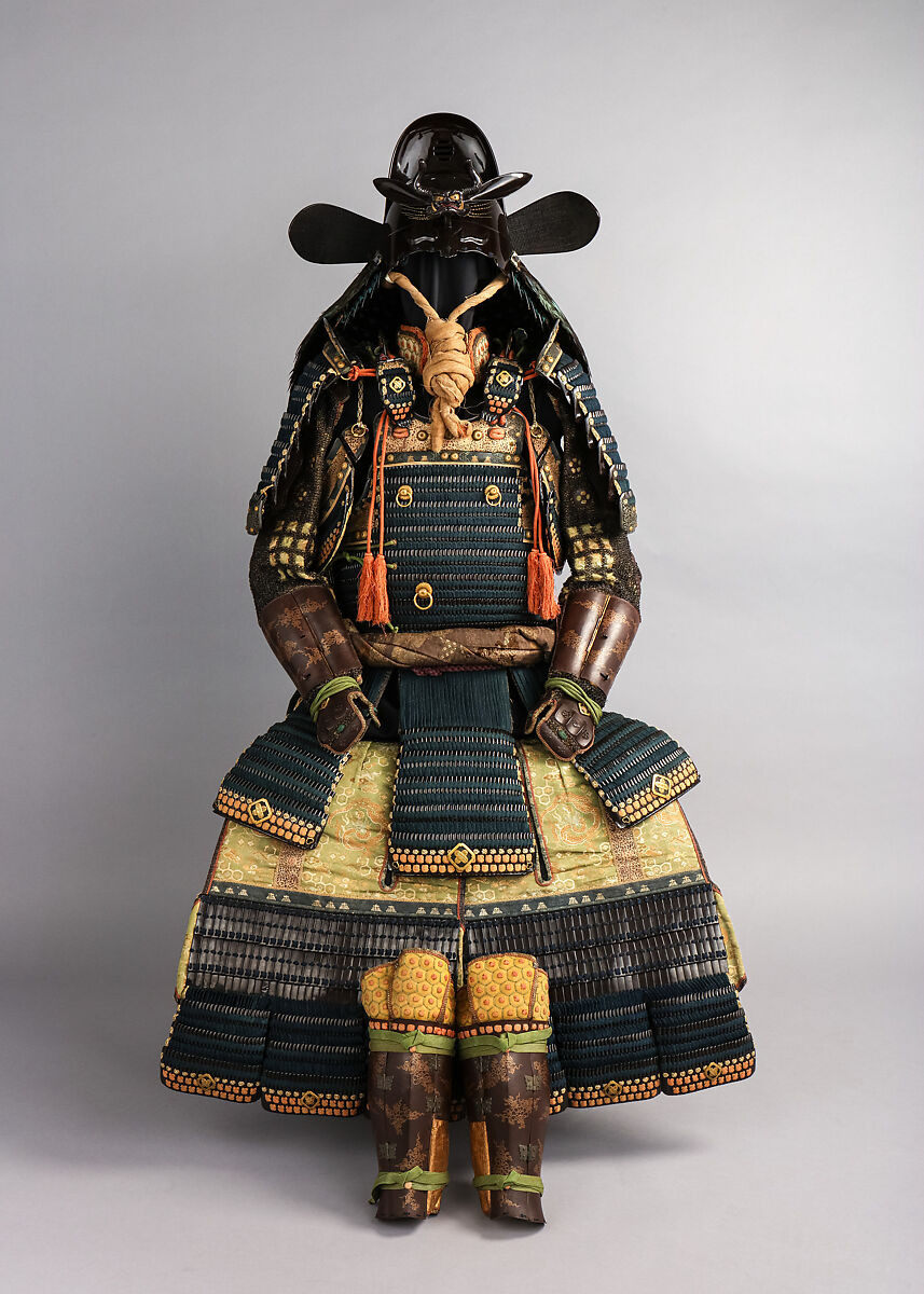 With its quality of workmanship and the extent of its additional elements, this suit is an outstanding example of a type of late Edo period (19th century) armors that revive traditional styles from before the sixteenth century. Following the pacification of the country in 1600, the practical use of armor waned and high-ranking warriors who were able to afford a newly made suit placed emphasis on its decorative effect. A striking feature of this suit is its additional elements, comprising an armored vest and a brocade-covered pair of sleeves with ornamental bright yellow felt shoulder guards (sode), which can be worn on less formal occasions. Although several examples exist where parts of an armor contain compartments, the use of a medicine container with spoon and an inkstone with brush as it is the case here is unique and not seen on any other known suit. The helmet is associated with the armor and dates slightly earlier (mid-18th century). Pairing helmets with other armors was a common historic practice, and the quality and style of the helmet described here certainly matches the suit.