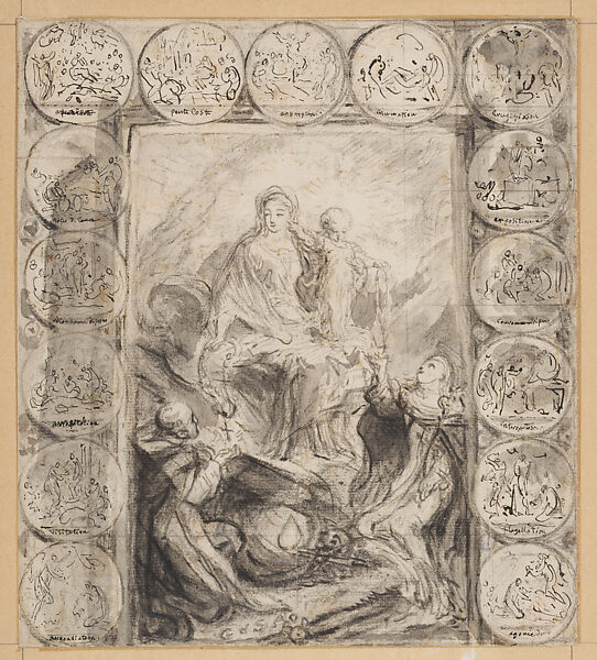 In this rare example of a religious subject, two saints kneel at the feet of the Virgin and Child. Lining three sides of the border are small roundels featuring episodes from the life of Christ, each labeled by Saint-Aubin in his distinctive tiny script.