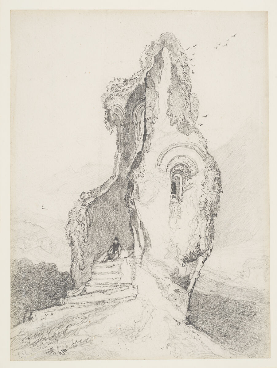 Cotman may have created this evocative image of an isolated, ruined tower during a sketching session, or as a teaching tool. For much of his career, the artist supported himself as a drawing master in his home town of Norwich and then, from 1834, as Master of landscape drawing at King's College School in London. During regular tours in England, Wales and Normandy, he sought out medieval architecture and drew forms in silhouette, emphasizing ornamented doors and windows. In this romantic image, a lone figure rests on the steps of a decayed structure whose cliffside position seem precarious. A counterpoint of dark and light moves from a small window that pierces a bright stone wall, into the shadowed interior of the ruin. Small birds soaring at right accentuate scale and the void of the adjacent valley.