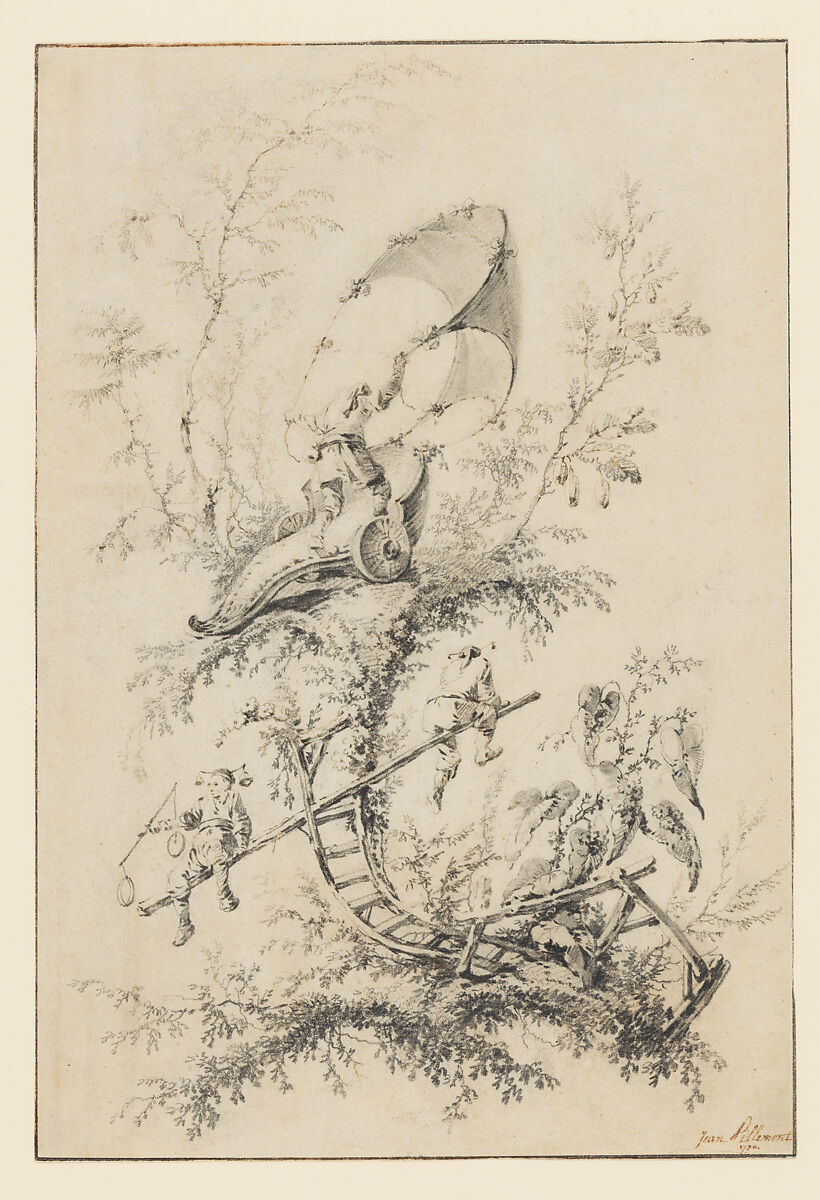 While he was also active as a prolific landscape painter, the French artist Jean Pillement is perhaps best known today for his playful and imaginative Chinoiseries designs. Principally meant for decorative panel paintings, though generally widely applicable, his designs consisted of vignette-like landscapes that he filled with figures or genre scenes that were meant to evoke a Chinese setting. Many of his designs were translated into print series that were avidly collected and served as inspiration for artists working across a variety of disciplines in the decorative arts. This drawing by Pillement relates to a print in the series "Cahier de Balançoires Chinoises", which was published in 1771 or 1773 and contained etchings by Jean Jacques Avril and Martin Demonchy. The composition consists of an overgrown ladder-like folly with a plateau at top onto which a cart is placed, one figure stands on the cart while holding a sail that is billowing as if catching a big gust of wind. Below, two figures are balancing on a beam that has been placed atop one of the spokes of the ladder and functions as a see-saw. The whole scene is surrounded by fantastical vegetation typical of the work of Pillement.