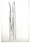 This sheet, along with two related works, is an early example from Kelly’s body of drawings representing the contours of leaves, plants, trees, fruits, and flowers, a practice begun around 1948 at his summertime retreat along the Atlantic coast of France. As Katherine Sachs writes in the catalogue for the Philadelphia Museum of Art’s 2009 exhibition Cézanne and Beyond, which included this trio, Kelly had long admired Cézanne’s painting Chestnut Trees at the Jas de Bouffan (ca. 1885–86, Minneapolis Institute of Art), which he first encountered in Rockwell Kent’s book World-Famous Paintings. The canvas shows a line of dark tree trunks silhouetted against a scenic backdrop with a country wall, green hill, and Mont Saint Victoire in the distance. Kelly was particularly attracted to the way the trees form a screen that fractures the view and creates fascinating, geometric forms in between their trunks and branches. For Kelly, the negative space between shapes is often just as important, if not more so, than the shapes themselves. Here, the same trunk(s) of trees create delicately shifting, serpentine forms between and around them, producing readymade geometries of natural design, closely observed.