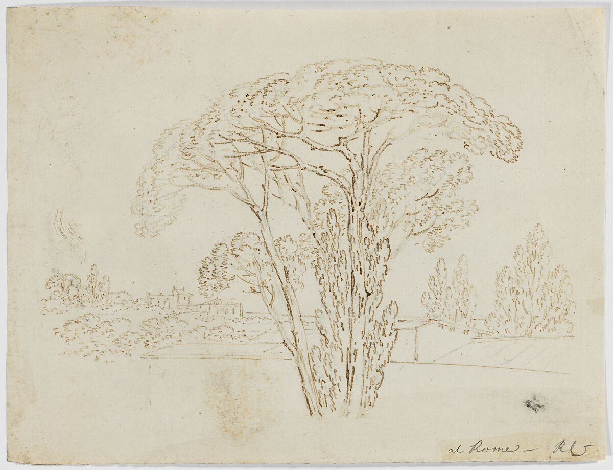 Born in Edinburgh, Cooper II trained as an engraver under his father, then studied in Paris with Jacques Philippe le Bas (1707-1783). He made these drawings during a visit to Italy in 1771-76 and, until recently, they were preserved in an album that descended in the family. Interestingly, each composition relates closely to a drawing in a sketchbook that Joseph Wright of Derby (1734–1797) used in Rome in 1774-75 (57.102.1(1-44)). These visual links suggest that the two artists sketched together and possibly took it in turns to use an optical instrument. While the outlines of the related compositions are close, each was then developed in markedly different ways. This drawing relates to Wright's sketchbook page 57.102.1(26).