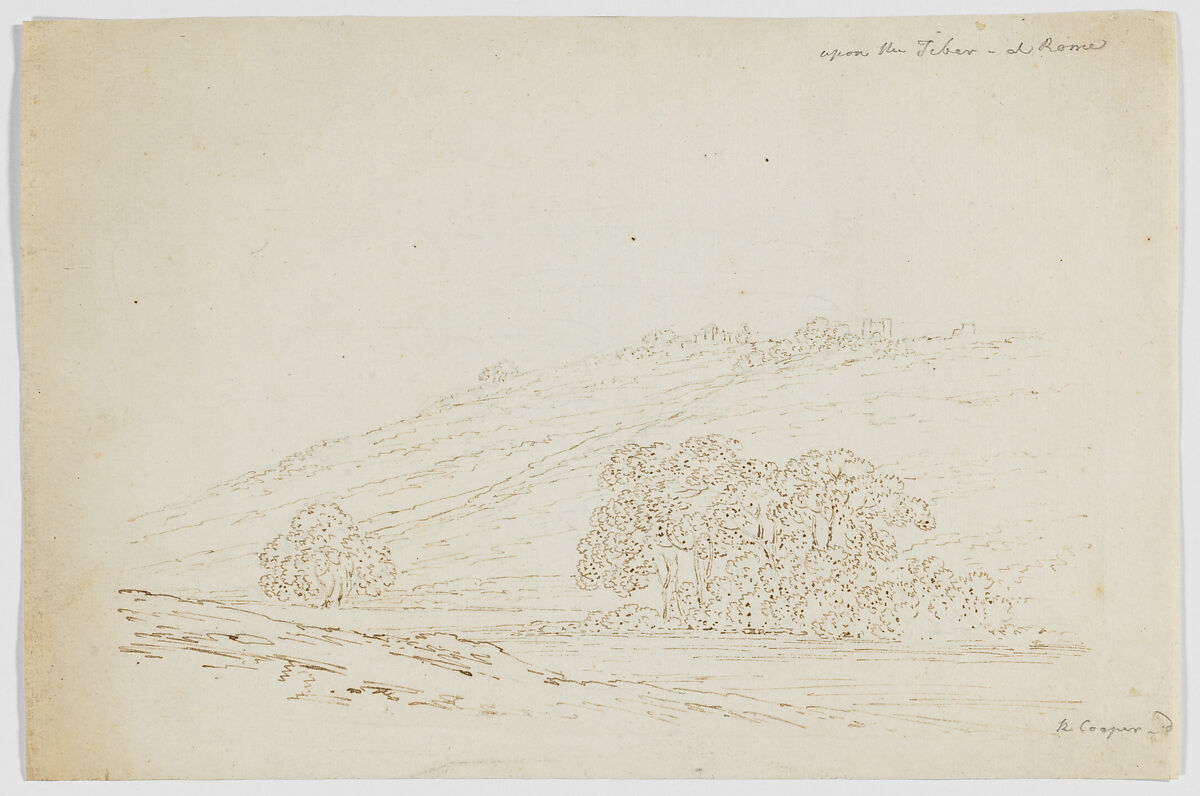 Born in Edinburgh, Cooper II trained as an engraver under his father, then studied in Paris with Jacques Philippe le Bas (1707–1783). He made these drawings during a visit to Italy in 1771–76 and, until recently, they were preserved in an album that descended in the family. Interestingly, each composition relates closely to a drawing in a sketchbook that Joseph Wright of Derby (1734–1797) used in Rome in 1774–75 (57.102.1(1-44)). These visual links suggest that the two artists sketched together and possibly took it in turns to use an optical instrument. While the outlines of the related compositions are close, each was then developed in markedly different ways. This drawing relates to Wright's sketchbook page 57.102.1(33).