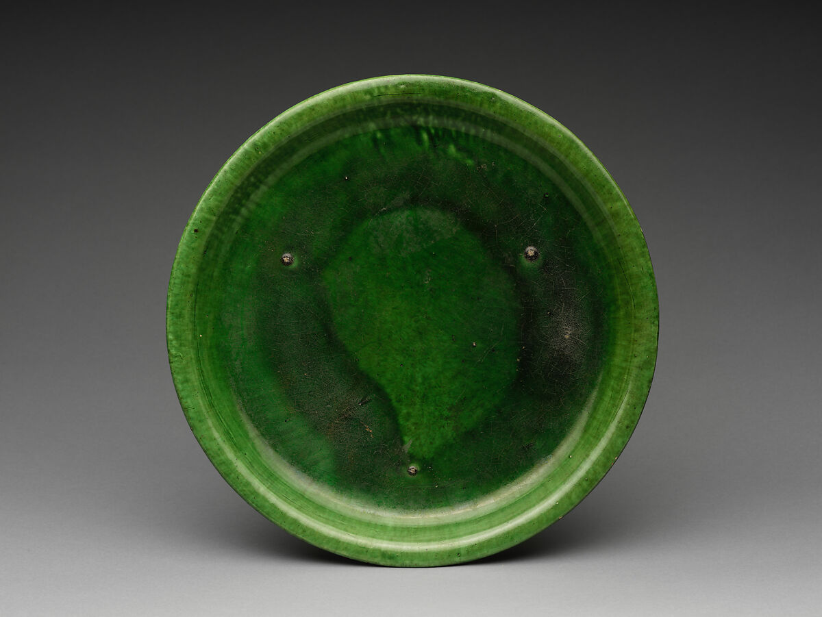 This large offering dish, with its high-fired dense body, lustrous glaze, intense color, and elegant form, represents the refinement of works created by craftsmen of the Tang dynasty. The shape of the piece, including the raised rim with a folded lip and curving wall, and the animal’s paw-shaped feet, reflects the influence of metalwork ultimately from Central and West Asia.
