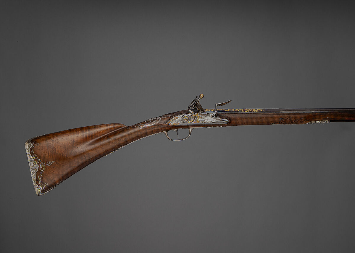 This very fine flintlock gun is of the same period as another French gun by Le Faure and Mollier in the Met's collection (acc. no. 1990.114.1) and it is stylistically related to it in the ornamentation of its stock, barrel, and mounts. However, its mounts are not of steel, but of cast and chased silver, and its stock shows greater restraint in the use of silver wire inlay. The rear of its lock is chiseled with a design borrowed from the 1705 edition of an influential album of patterns for gunmakers, which also provided the inpsiration for the decoration of elements of the related gun. Very few works by Charrière appear to survive.