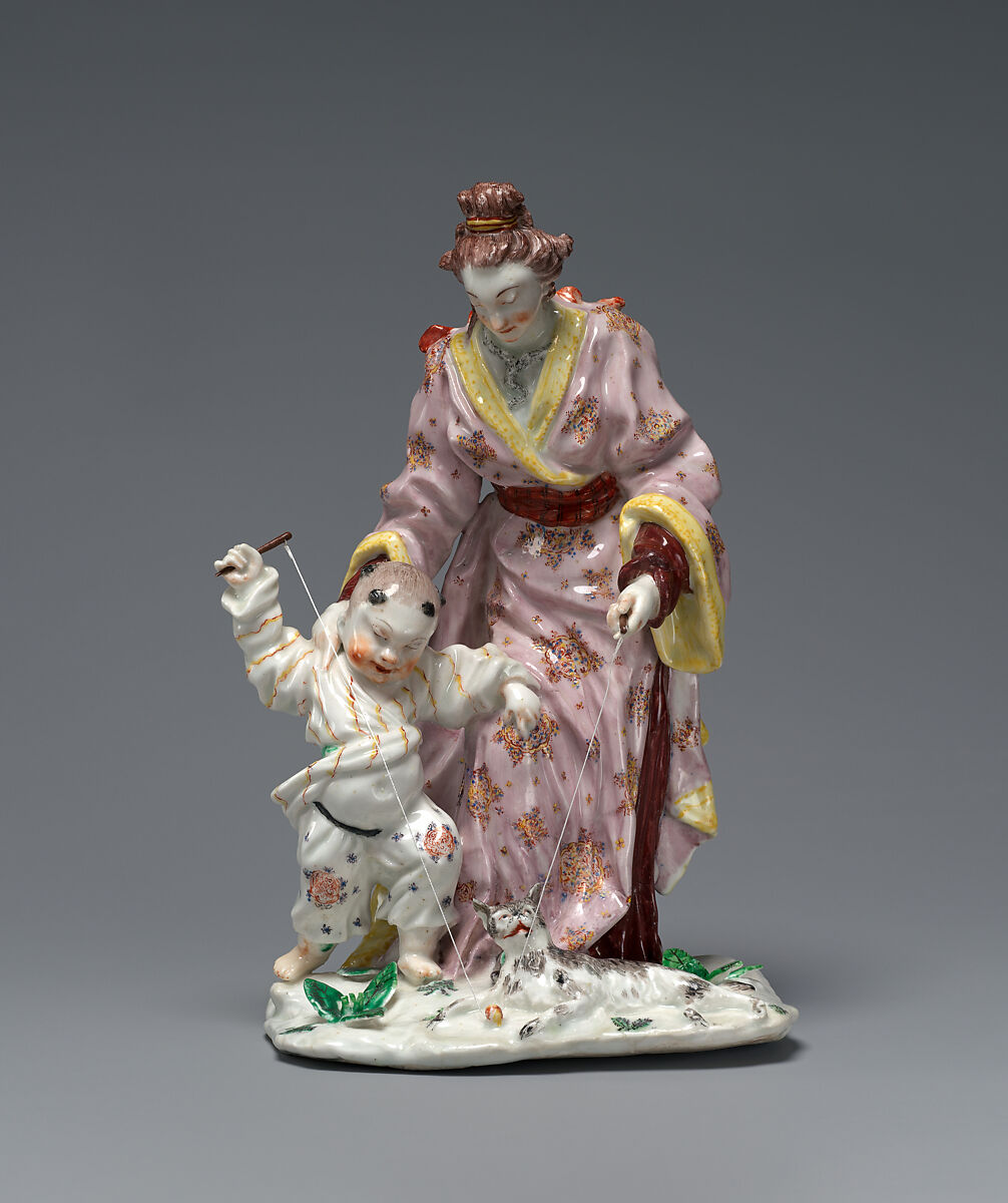 This rare figural group by the Chelsea porcelain manufactory is a moving and intimate portrayal of a mother and child playing yoyo with a cat. Wearing Chinese costumes, the group is based on a composition by François Boucher entitled “Le mérite de tout pais,” first issued as a print in 1742. Modeled around 1749-50 by the Flemish sculptor Joseph Willems, the work is one of only two known recorded examples of this composition and is the only enameled example. It represents an early and experimental work, as Chelsea attempted more ambitious compositions of figural sculpture.
