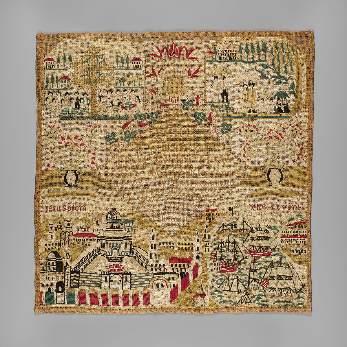 Anna Huntington’s sampler, completed in 1803, belongs to a group of three samplers from Franklin, Connecticut, which are thought to have been made under the instruction of the Misses Nott, who educated young ladies in the parsonage of their father, Congregationalist minister and educator Reverend Samuel Nott (1754-1852). Her sampler, and that of Laura Hyde (MMA 44.113) are graphically striking, and unique in that they are embroidered with scenes from parts of the world that were just opening to trade with the United States at the time they were stitched. They both feature images of American sailing ships in faraway locales; Anna’s sampler depicts views of the walled city of "Jerusalem" and "The Levant", with American ships in a choppy harbor, while Laura’s sampler shows scenes of "India Within the Ganges" and "The Bay of Bengal". The images of foreign lands were likely copied from engraved plates in books about travel to "exotic" places, which would have been considered highly educational sources of study for young ladies. The turn of the nineteenth century saw a greater emphasis on the intellectual education of girls. Young women of the new American Republic were expected to be literate, understand basic mathematics, and be familiar with world geography, in addition to learning traditional female skills such as sewing and embroidery. Another factor in the prominence of the foreign scenes may be attributed to the beginnings of the Christian missionary movement—in fact, Reverend Nott was the president of the Norwich Missionary Society, and a member of the Missionary Society of Connecticut. His eldest son, Samuel Jr., was one of the first five missionaries sent to India in 1812. Perhaps Anna’s scenes of the Levant and Jerusalem reference areas where American missionaries hoped to journey.