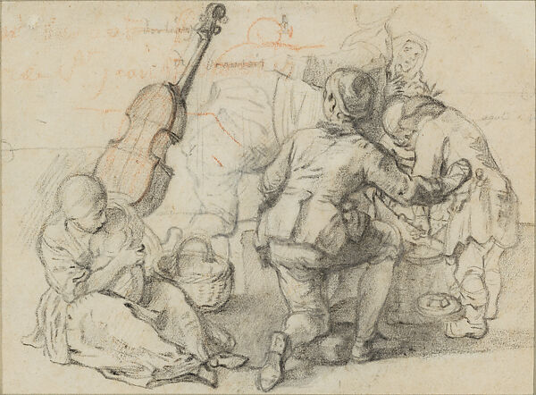 We see a woman seated on the ground holding a baby and a group of young boys crowding around some source of entertainment. Visible to the left of the boy in the foreground kneeling on one knee is an initial sketch of the pose, drawn more faintly. Most of the figures and objects on this sheet would be used in Saint-Aubin’s painting The Country Dance, today in the J. Paul Getty Museum, Los Angeles.