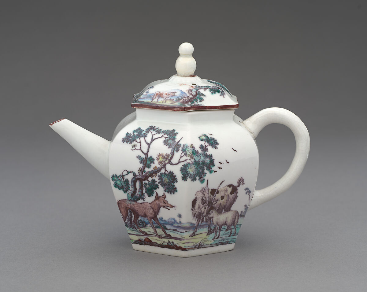 The Chelsea factory often used illustrations drawn from Aesop’s Fables to decorate porcelain in the early 1750s. Much of the best painting of Fable scenes was executed by Jefferyes Hammet O’Neale, to whom the decoration of these pieces is attributed.