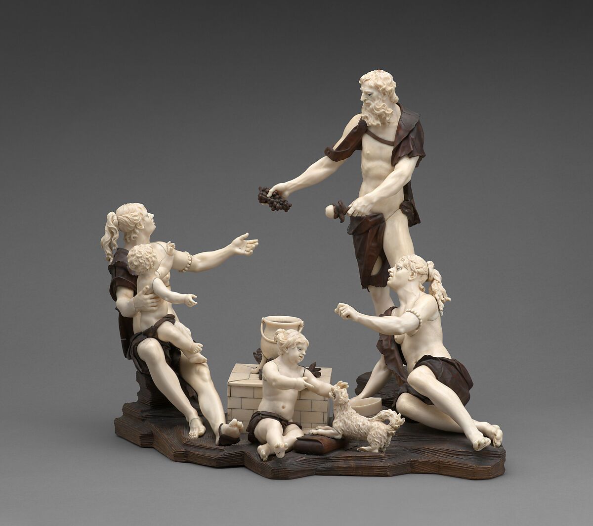 Gathered around a cooking pot, this group of raggedly clad, but sensitively carved figures prepare a meal together. The standing figure, a bearded man, extends his right hand, offering a bunch of grapes to one of his companions. The grapes and the pomegranate in his left hand identify the man as either Joshua or Caleb, the two successful scouts sent out by the Israelites, after they left Egypt (Numbers 13:17-30; Deuteronomy 1:22-40). A second man, also holding grapes, once accompanied the group as a complementary, but separate, sculpture to complete the biblical pair. Simon Troger, a distinguished sculptor from East Tyrol, was a master of the multi-material technique demonstrated here. The dark wood and white ivory create a contrast in texture and color that animates the sculpture, while sparkling glass eyes enliven the faces of Troger’s figures.