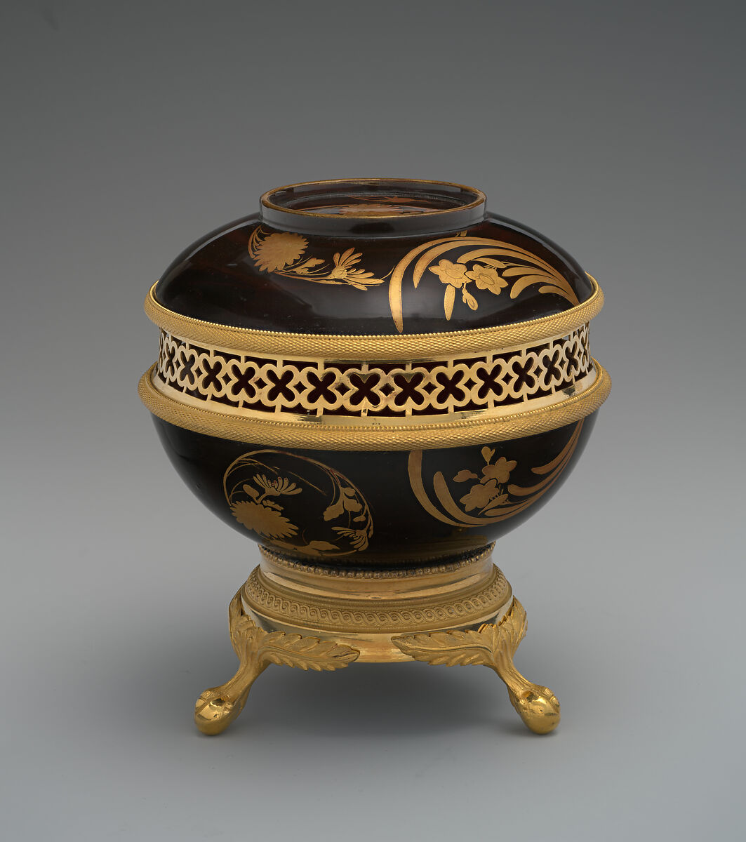 Transforming the lacquer bowls from dinnerware into potpourri holders and elevating them into objets d’art, the mounts are conforming to European taste and possibly are the work of the British firm of clockmakers Vulliamy. This firm was established by François Justin Vulliamy, a successful clockmaker of Swiss origin, who moved to London. in 1730. His eldest son Benjamin (1747–1811) went into business with his father in 1780 (Vulliamy & Son). Father and son worked together until François Justin died on 1 December 1797. Benjamin’s success in his designs for clocks led him to design other luxury items as well, such as inkstands, lighting, as well as metal mounts for other fashionable objects. The high quality of the metalwork certainly suggests the work of an experienced and successful artist as Vulliamy. However, there were other firms making similar mounts in Britain as well, but without a stamp or signature, it is difficult to attribute the mounts to a particular artist or firm.
