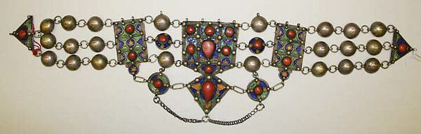 The bright polychrome enamels ornamenting the surface of this object reveal that it was created by the Kabyle people, an Amazigh (Berber) group in Algeria. Head ornaments such as this example would have been worn as a diadem, wrapped around the forehead, the pendants falling just at the top of the eyebrow. Red coral was a favorite gemstone of the Kabyle culture, though imitation gems in glass or plastic were common substitutes.