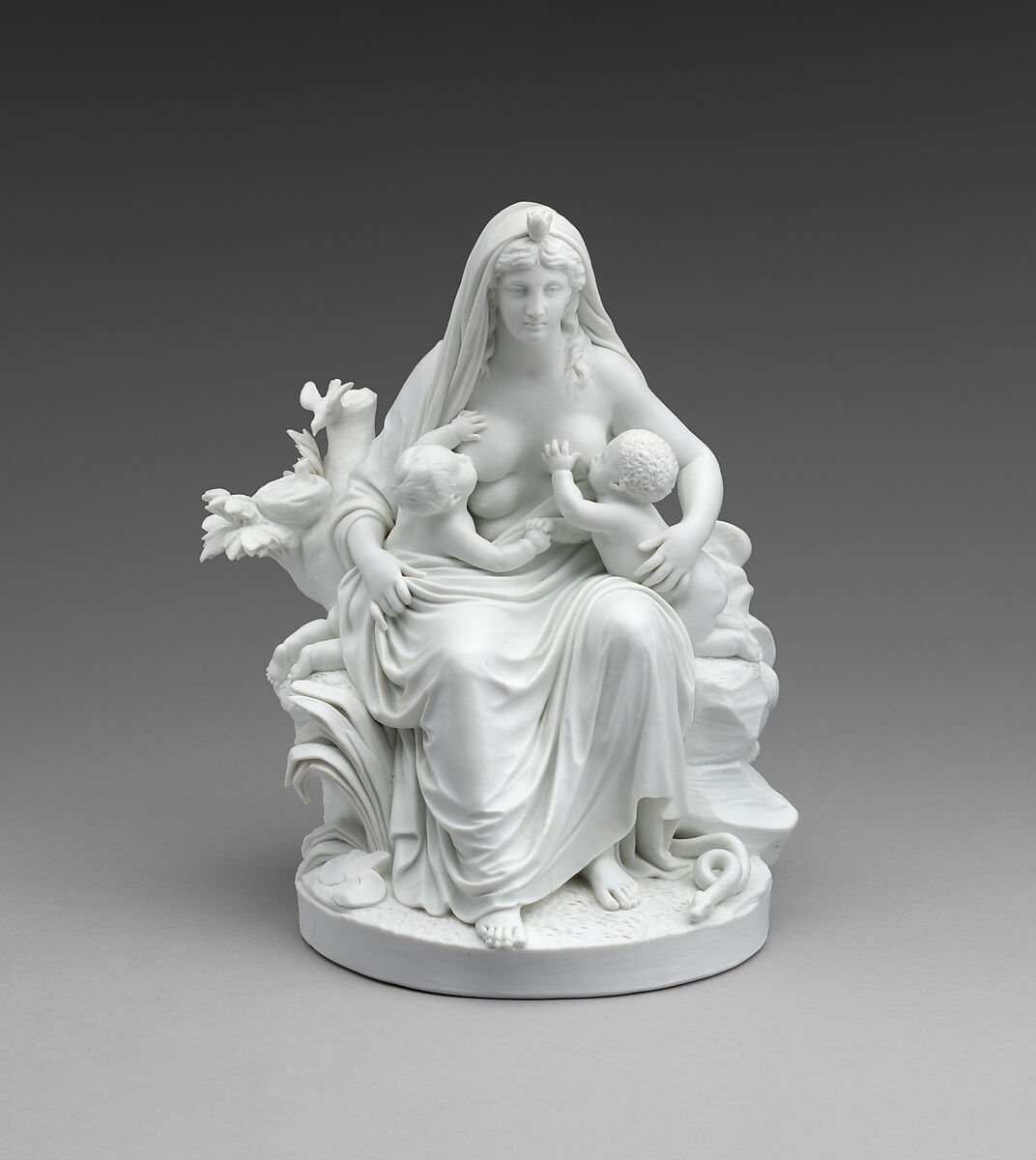 Made of biscuit, or unglazed hard-paste porcelain, this depiction of a female allegory of Nature nursing a black child at one breast and a white child at another, is a rare example of biscuit sculpture made at Sèvres during the French Revolution. Boizot’s sculpture was only one of two other examples of abolitionist biscuit produced at the Sèvres manufactory beginning in 1789 with this example commemorating the abolition of slavery in the colonies in 1794. Revolutionary iconography often conflated ancient maternal figures such as Cybele, the Roman goddess of fertility and Artemis of Ephesus, the Greek mother-goddess cult figure often shown with multiple breasts. Boizot has invented a humanized yet stoic portrait of Nature with the six breasts typically found on ancient cultic statues, which allegorize the nourishment of the new French nation. Beyond its unusual experimental iconography, Boizot’s biscuit sculpture entwines race, the colonies, and women in ways that highlight these subjects’ relative absence in the predominant visual and textual discourses of the Terror.