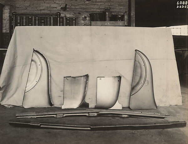 Draped sheets and soiled drop cloths transform the industrial interiors of a Philadelphia factory into makeshift photo studios. Isolated before them, the component parts of cars and trains become inadvertent elements of modernist picture-making. Deadpan views like this were once strictly utilitarian; they served as raw data to be cropped and incorporated into company pamphlets, patent illustrations, and instructional manuals. Nevertheless, the finely molded metal pieces are arranged before the camera with a keen attention to volume and scale. The factory’s in-house imaging team here exhibits a formal affinity with New Vision photographers, who were enamored, around this time, with the sleek aesthetic of American manufacturing.