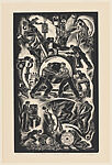Labor in a Diesel Plant is an idealized image of industrial manufacturing that conveys the dynamism of a contemporary factory. Arranged vertically, the composition features images of men and machines working in tandem. While the mechanical motifs recall imagery from Charlie Chaplin’s acclaimed film Modern Times (1936), Calapai presented harmony and productivity rather than the chaos and reification Chaplin depicted. Calapai’s celebration of industrial workers, use of non-naturalistic space, and application of other compositional strategies evoke revered murals by artists like Diego Rivera (such as Detroit Industry Murals, 1932–33) as well as American artists associated with the Works Progress Administration (WPA). Calapai, in fact, had experience with murals, having made them for the WPA, in addition to producing prints.