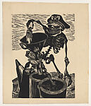 In 1951, the American artist and activist Dimondstein moved to Mexico after being blacklisted during the McCarthy era. While there, he taught art and worked with revolutionary artists, including the muralist David Alfaro Siqueiros, and joined the Taller de Gráfica Popular, creating prints such as Cannon Fodder that expressed his opposition to authoritarian regimes. A giant menacing skeleton wearing a hat with a fascist eagle insignia gingerly drops a man into a large black funnel. A smaller figure resembling the Spanish dictator Francisco Franco wraps his arms around the funnel’s base so that it empties into the barrel of a cannon. There, desperate men attempt to escape. The work likely draws on Dimondstein’s own experience witnessing combat while serving in the U.S. Army during WWII.