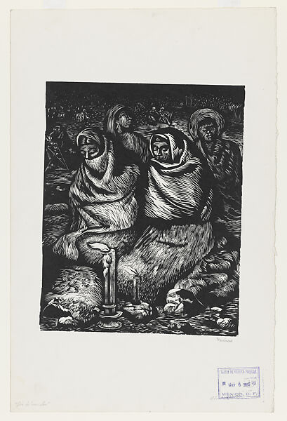 The Day of the Dead is traditionally celebrated in Mexico each year in early November to pay respects to and remember friends and family members who have died. Celebrations can have a humorous tone as those involved recount events and anecdotes about the departed. In Mexiac’s print, the commemoration is somber. Set at night, the scene depicts figures wrapped in garments, sitting on the ground in front of candles; in the background, other figures kneel before what might be portraits of the departed.