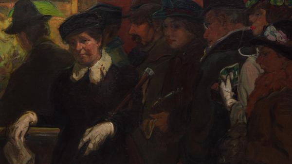 According to a 1922 account, the painting derived from months of study of various individuals standing in line for performances at New York’s Metropolitan Opera House. Established as an alternative to the old-moneyed and discriminatory Academy of Music, the Opera House drew a more diverse cross-section of New Yorkers. The painting includes a portrait of the artist’s mother, Anne Bernstein, who faces forward in elegant black-and-white attire, holding an umbrella and program. Music Lovers was acclaimed on its debut in the National Academy annual as "stunning," with other critics noting that Bernstein was a young artist to watch.