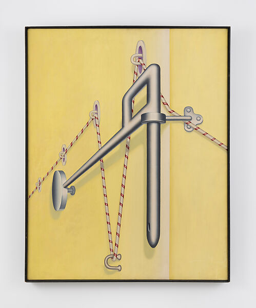 While studying at the Kunstakademie Düsseldorf beginning in 1954, Klapheck became immersed in Dada and Surrealism, absorbing the work of pioneers such as Marcel Duchamp, Man Ray, Max Ernst, René Magritte, and André Breton. In the wake of World War II, when artists questioned what a proper subject for art could be after the Holocaust, Dada and Surrealism offered tools to critique a society that led to war by turning to the sensual, the unconscious, and the primal. These movements also privileged the uncanniness of the everyday object, recontextualized and deployed to revelatory—and often absurd—effect. At the same moment, with a booming post war economy and a surge in marketing and advertising, artists like Klapheck and, on the other side of the Atlantic, Andy Warhol examined consumer culture as one of desire and want. Klapheck depicted office equipment and technical machinery atop stripped-down backgrounds to accentuate the sensual dimension in otherwise unremarkable objects. Here, a metal, phallic support bar seems to float in front of the yellow surface, and yet it is held in place by a bracket to the right and a receding element to the left. What seems to be floating is actually acutely angled, giving deep, illusionistic space to a picture that appears at first resolutely flat. The white vertical element behind the bar reads immediately like a Barnett Newman zip, piquing a viewer’s reflex to again understand the painting as flat. But upon second glance, the zip coalesces in one’s vision as an edge, articulating not a coextensive plane but a hinged one. The red-and-white rope, which is deployed as through a pulley system with hooks, plugs, and fasteners, also rounds the zip’s corner, until it disappears again out of the picture, to the world beyond.