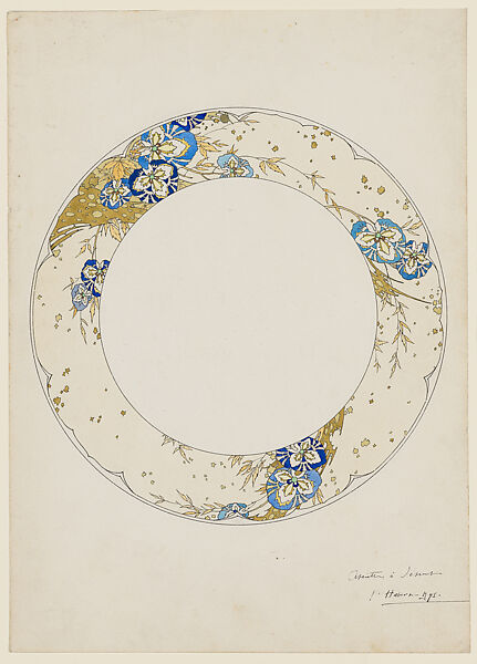 Habert-Dys was a pivotal figure in the French decorative arts in the transitional period from Japonisme to Art Nouveau. During the 1880s, he produced several portfolios of designs, most famous of which is his Fantasies Décoratives (1886/87), which was first issued in 12 installments. It contains designs for all-over patterns as well as object-specific pattern designs. Habert-Dys was highly sought after for the latter, in particular in the field of ceramics. This sheet with a design for a dessert plate is part of a small group of surviving drawings that suggest that Habert-Dys designed an entire ceramic dinner service with this pattern for the French firm Pillivuyt. The rim of the plate is decorated with a floral pattern inspired by Japanese porcelain decorations. The background is painted in an off-white/cream color while the flowers are executed in shades of blue combined with white and a pale yellow color. The leaves and abstract background elements are in gold-brown tones and were possibly meant to be (partially) gilded.