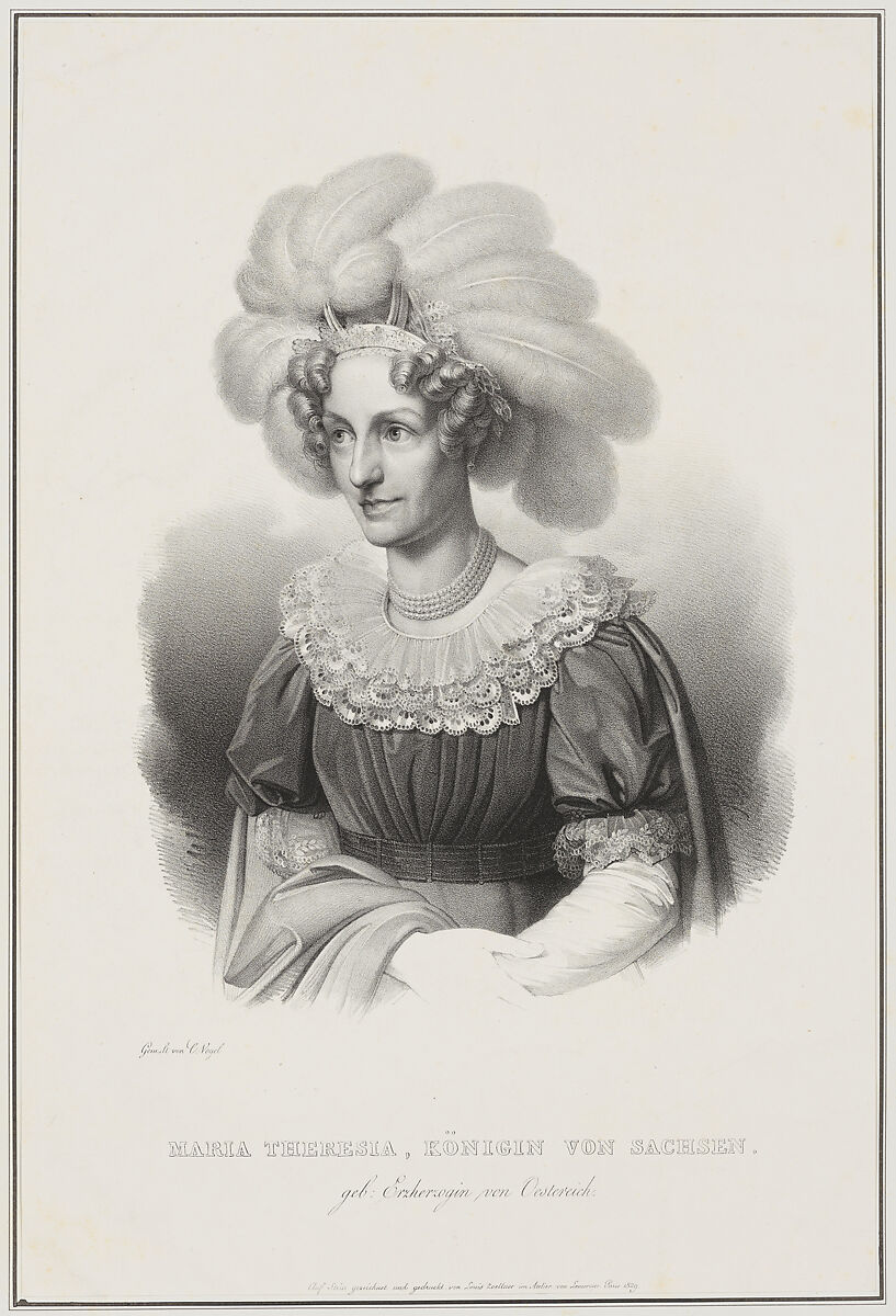 This lithographic portrait of Maria Theresa (or Maria Theresia), Queen of Saxony (1767-1827) belongs to a series of portraits of figures at the Saxon court in Dresden that Ludwig Theodor Zöllner produced after a design by Carl Christian Vogel von Vogelstein. Dated 1829, the print faithfully reproduces, in the same orientation, a drawing Vogel made in 1827, in the final year of Maria Theresa's life, which in turn relates directly to Vogel's own painted portrait of the queen (the primary version of which is in the National Gallery Prague) also dating to 1827--the year of the her ascension to the throne, just six months before her death.