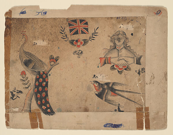 - Title: Page with four informal sketches: the Union Jack, a personification of Britannia[?], peacock in a tree, and a swooping robin