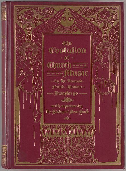 "Signed Louis Rhead Art Nouveau binding design in gold on smooth red cloth with the titles in calligraphic script within a central panel with an angel on either side with their wings open; one angel is playing the trumpet on the left, and the other on the right plays the organ. Floral decorative motifs above and below. Gold spine titles in calligraphic script with a floral border at the head and tail of the spine. Engraved title page signed by Louis Rhead with a central panel of children in classical dress playing music; the panel is surrounded by a border of lilies clearly inspired by Morris. The titles are in red and black. Printed on heavy laid deckle edge paper; top edge gilt A brief history of ecclesiastical music, with a goal of promoting a more informed selection of music for church services. A near fine copy of an exceptionally scarce Rhead binding design with light rubbing to the extremities and the contemporary library plate of A. N. Haggerty on the front pastedown. Not in PBO, UNCG or Minsky." -- Austin Abbey Rare Books