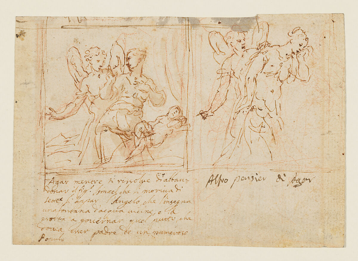 - Title: Two alternative designs for a composition of Hagar, Ismael, and the Angel, with the artist’s iconographic notes on the subject matter (recto); Fragmentary composition with a reclining woman and a cropped seated figure (verso)