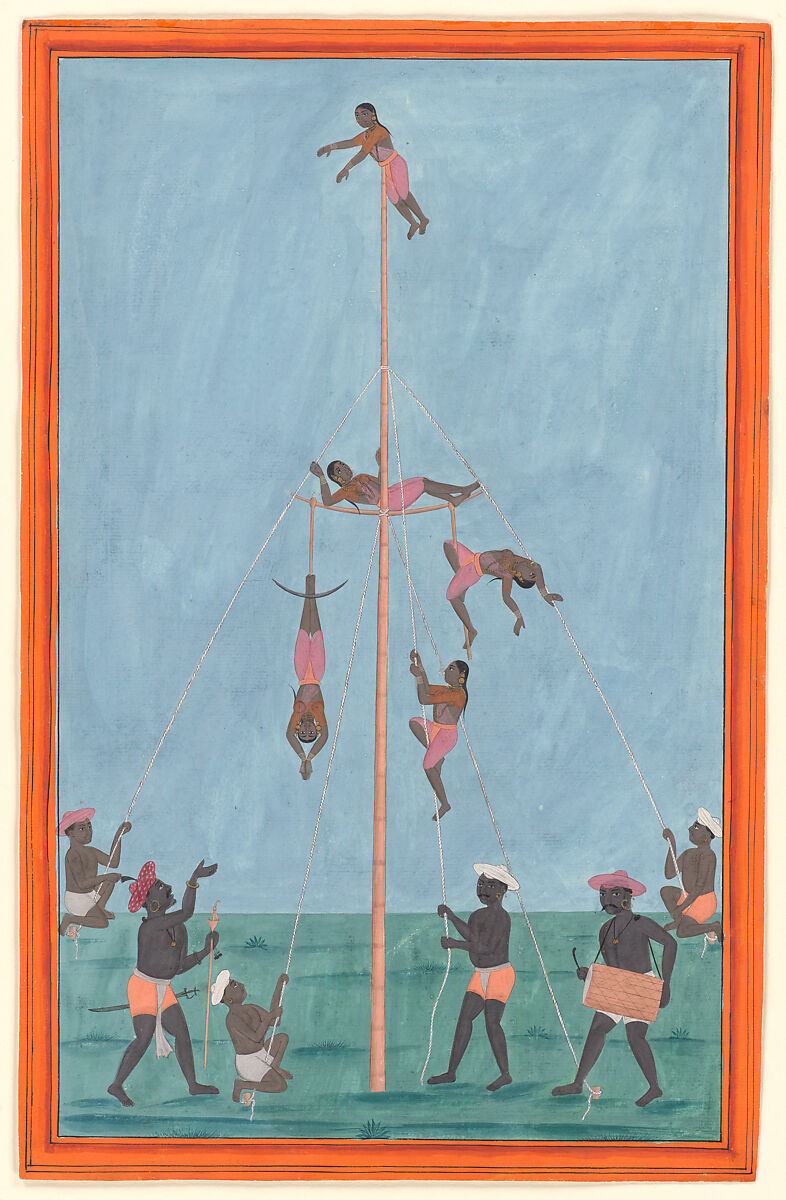 This painting depicts a troupe of fairground (mela) entertainers, consisting of five female acrobats suspended from a bamboo pole, accompanied by four male attendants who steady the pegged guy ropes while a drummer provides an accompaniment, and the supervisor of the troupe calls out instructions to those above. Both the women and men wear gold ear ornaments. The men also sport broad brimmed Thanjavur-style turbans; the troupe leader’s is especially handsome, being multicolored. The leader also wears a sword and carries a plumed and tasseled staff. Such entertainers were itinerant, earning their living by travelling to towns and villages on temple festival days to provide popular entertainment. This painting once formed part of an album of paintings of observed daily life commissioned by George Macartney (1737–1806), who served as Governor of Madras from 1781 to 1785. The album presumably returned with him to England in 1786, at the end of his governorship.