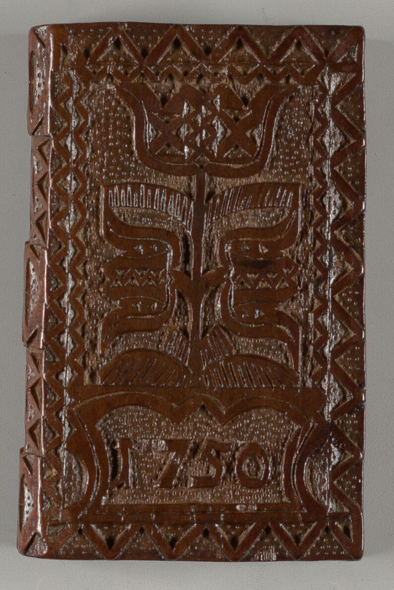 Solid wood box with sliding lid, all carved in low relief - some in chip carving fashion - with similar tulip motifs on both covers. Only the fixed front cover received the added date of 1750, reserved inside a recessed field below the tulip. All recessed surfaces are covered in stippled punchwork. The spine is divided into five fields with alternatingly raided cross motifs. The book edges are left relatively plain, with the concave surfaces only receiving a cross motif in stippled form. On the fore edge, the suggestion of two clasps were left standing against the concave recesses. Business card inside from Suchow and Seigel.. -- description by Mindell Dubansky in consultation with Lynn Heckman.