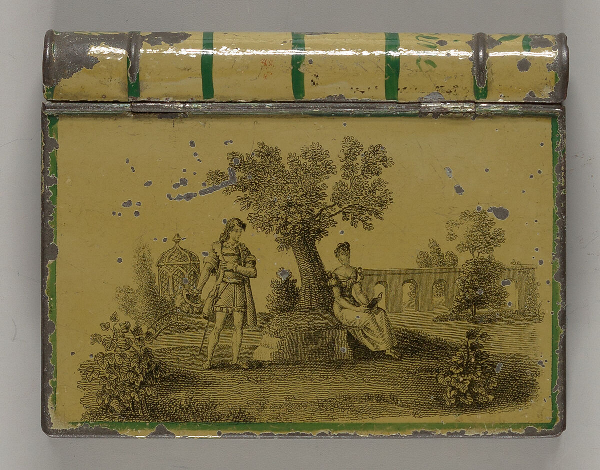 Probably a table or traveling lantern for ladies, painted light green with transferware etchings in black on both covers with romantic rural scenes; rounded spine hand-painted with title in six panels with flowers painted in the top and bottom panels and five painted lines depicting a traditional book spine.-- description by Mindell Dubansky in consultation with Lynn Heckman