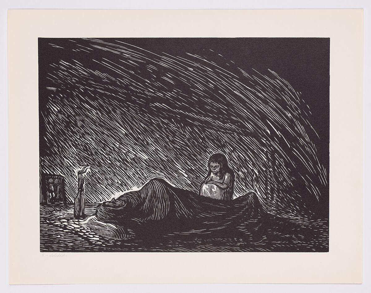 This print is from a portfolio of ten linocuts that Méndez created for Río Escondido, a film by Emilio Fernández that was released in 1948. The prints were shown as backdrops for the film’s title and credits. The story follows a schoolteacher who arrives in the remote Río Escondido to find a ruthless landowner controlling the town. The teacher’s dignity and strength in the face of oppression and her poor health are the focus of the narrative. Resembling a cadaver, the teacher is shown here in a darkened space being watched over by a small child.