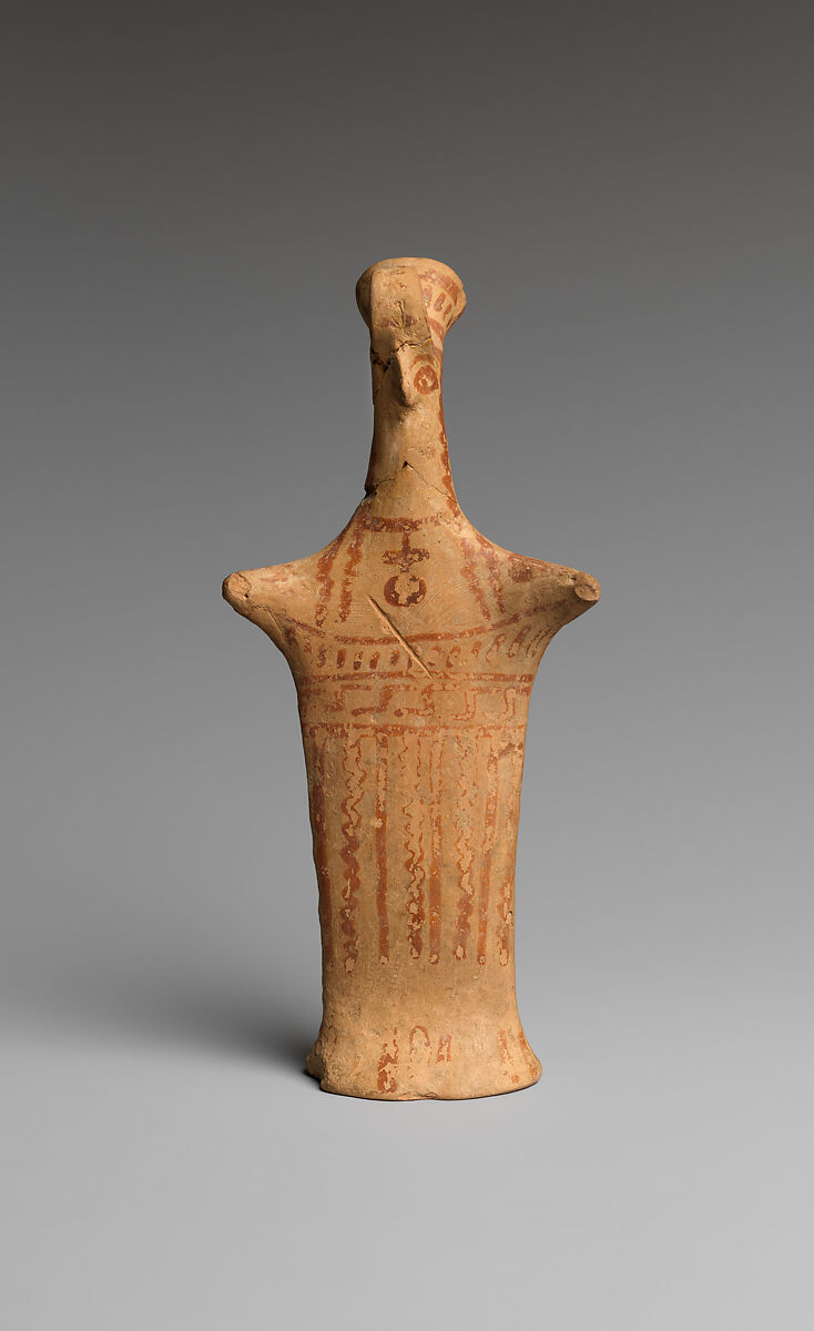 The polos (headdress) with a volute suggests that the figure is a goddess, probably Persephone, queen of the Underworld. Many statuettes of this type wear a necklace with a pomegranate, a symbol of death and rebirth. The great majority of the Boeotian plank-shaped statuettes with known findspots have been discovered in graves, and come primarily from the necropoleis, or cemeteries, of Ritsona, Akraiphia, Tanagra, and Thebes.