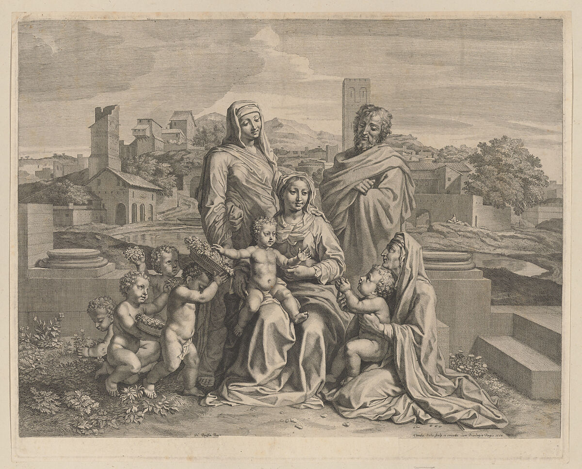 Between 1668 and 1687, Claudine Bouzonnet Stella created six prints after French classical painter Nicolas Poussin. Here, in the earliest of the group, Bouzonnet Stella already demonstrates her virtuosity at translating Poussin’s paintings into a grayscale. Bold engraved lines consolidate the Holy Family group in the foreground. By contrast, wavering strokes of etching lend the distant landscape a haziness true to Poussin’s atmospheric horizons. The Latin title of this work was mysteriously erased from the plate before printing, perhaps to appeal to a broader audience. According to an earlier state of the print, Bouzonnet Stella had quoted a line from Ecclesiasticus 24 that references the Virgin Mary, thus underscoring her visual centrality in the composition.
