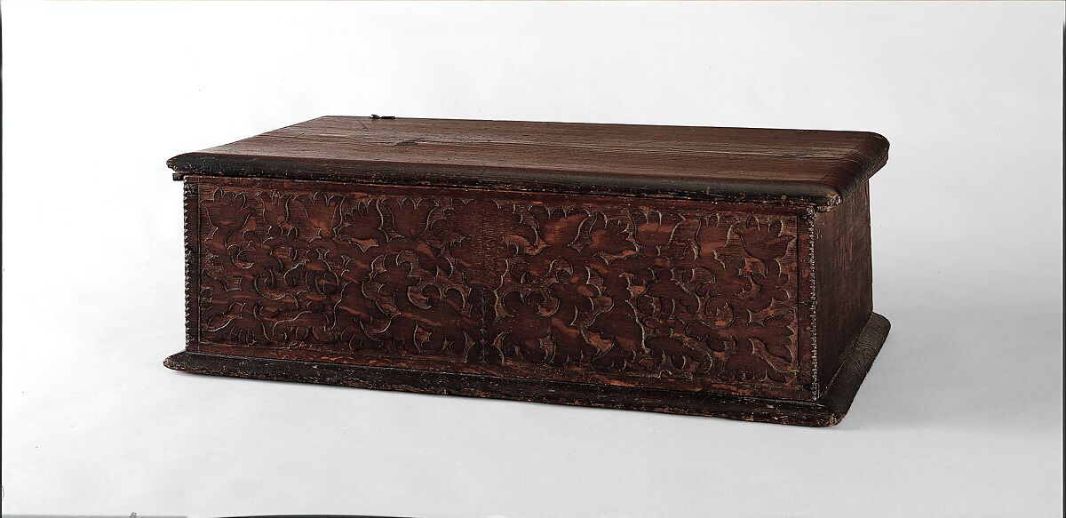 The most common small storage unit in the seventeenth century was the rectangular box with a hinged lid. Boxes provided a place to keep valuables, documents, writing implements, books, and small articles of apparel. Except for one rare example decorated with applied moldings, these boxes are carved utilizing a vocabulary of stylized plant forms and simple geometric shapes. The boxes are all of simple five-board nailed construction and have a deep association with America’s so-called "Pilgrim Century." They were avidly sought after by the earliest collectors of seventeenth-century American oak furniture, hence their acquisition by the museum in 1910 as part of the foundation for the museum’s collection of early American furniture.