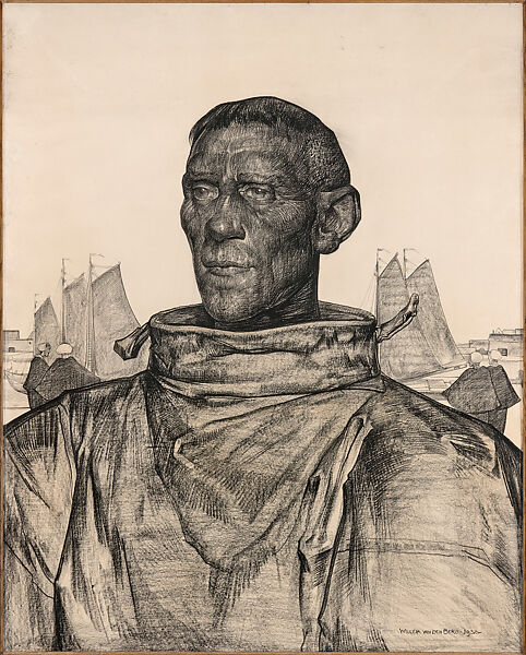 Willem van den Berg was an influential figure in Dutch academic circles of the 1930s and 40s. He is best known today for his portraits of fisherfolk from the port towns of Scheveningen and Volendam. While this work is a portrait of a specific individual, the monumentality of the figure and pathos of his expression suggest that he also serves as a stand-in for a significant character in the Dutch cultural imaginary—the stoic, hardworking laborer extracting their livelihood directly from the sea or land. Created in the lead up to World War II, van den Berg’s portraits represent the longing for a return to a pre-industrial order, unthreatened by advances in modern technology and the accompanying social, cultural, and political changes they set in motion.