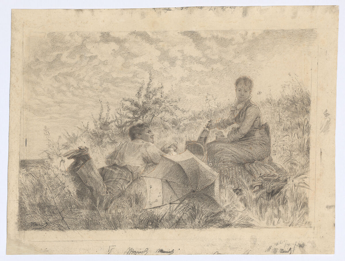 In 1882, Marie Bracquemond published drawings corresponding to each month of the year in "La Vie moderne," an illustrated weekly founded by George Charpentier, a champion of the Impressionists. Although, it does not appear to have been reproduced, this drawing of a late summer scene relates closely to that series in its style and format. Against a striking sky patterned with clouds, a couple lounges in the long grass of a gently sloping hillside. In contre-jour, the woman gazes outward as she pulls a bottle of wine from her picnic basket and a butterfly flits past her proper left shoulder. This scene of plein-air leisure with its exploration of lighting effects and evocation of the fleeting moment embodies many of the qualities associated with the Impressionist aesthetic. Marie exhibited with the Impressionists in 1879, 1880, and 1886, and was one of only three women to do so under her own name.