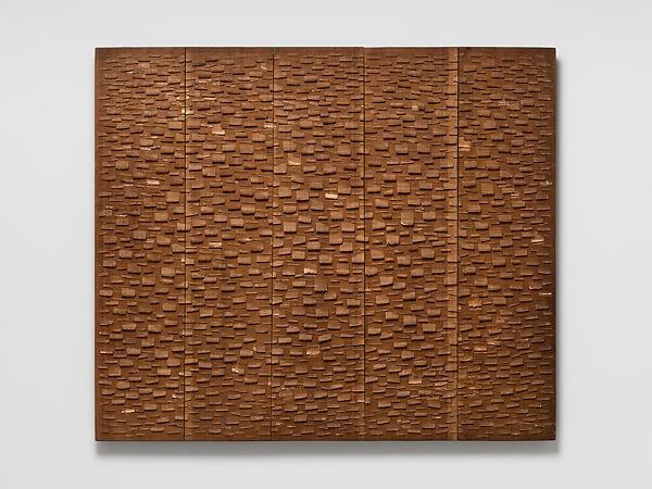 Cut Up is part of Lee Ufan’s groundbreaking series of the same name that began in the late 1960s and ended in 1974. At the time, Lee was the key theorist of and participant in Mono-ha (School of Things), a group in Japan that made sculptural interventions to explore the relationship between material and space, a practice deeply informed by East Asian aesthetics; at the same time, he was also contemplating a return to painting. The year before making this work, during his first visit to New York, Lee saw Barnett Newman’s Concord at Newman’s Museum of Modern Art retrospective, which influenced Lee’s use of minimal marks to register maximum effect. For Cut Up, Lee incised the wood surface repeatedly in one direction with a chisel. The cuts of varied depths all over the composition create a field of suspended flaps whose volume, shape, and shadow activate the space around them. These disruptions on the flat surface emphasize material over gesture and ultimately push the definitions of mark-making, painting, and sculpture.